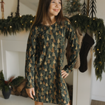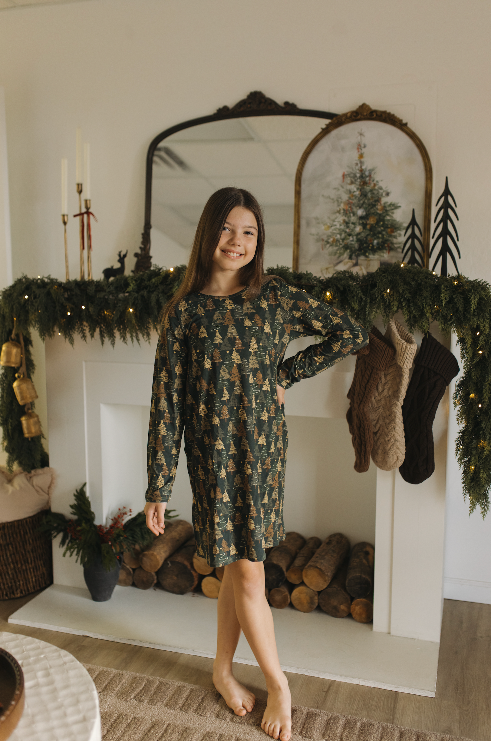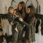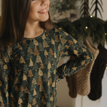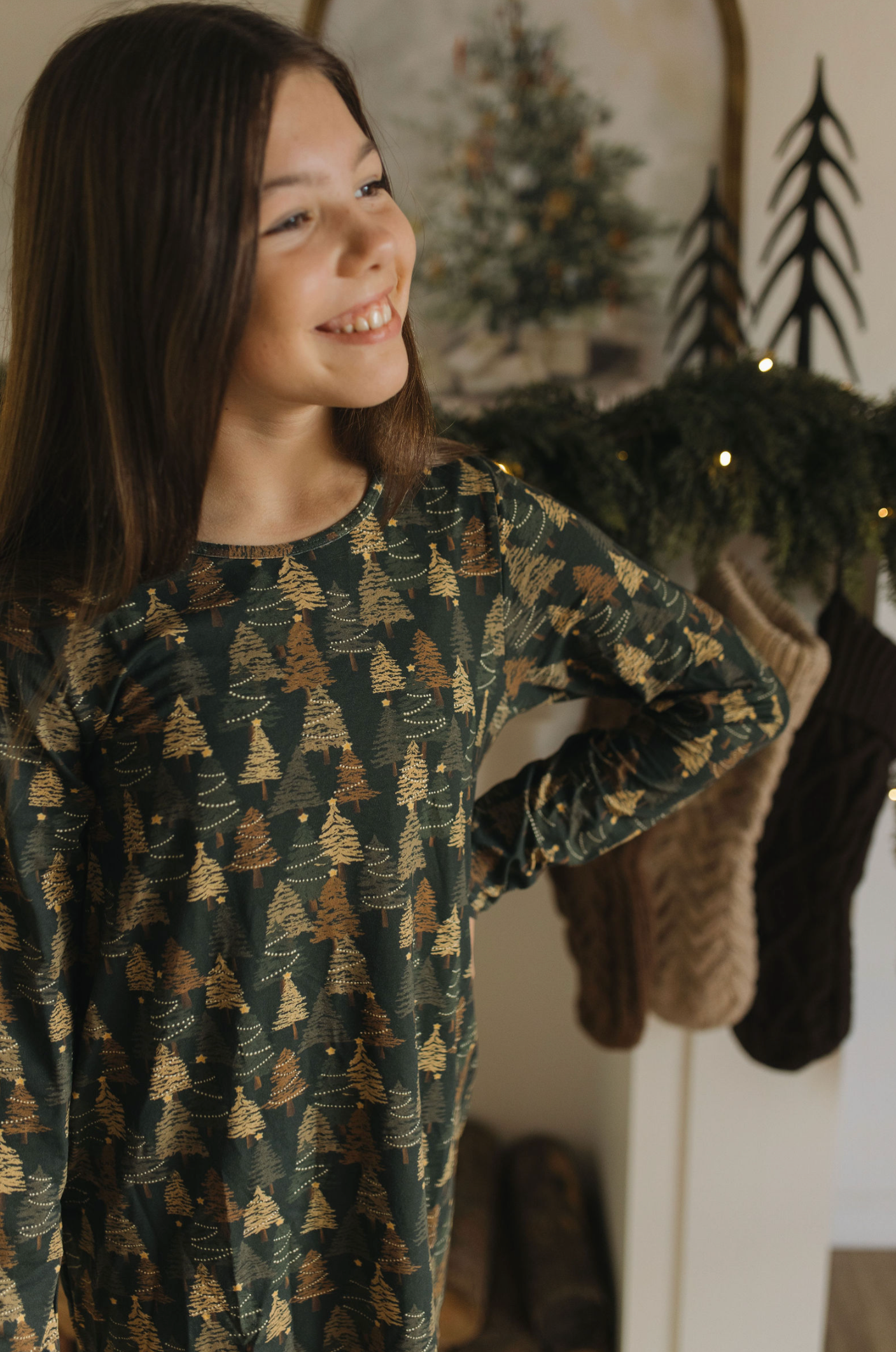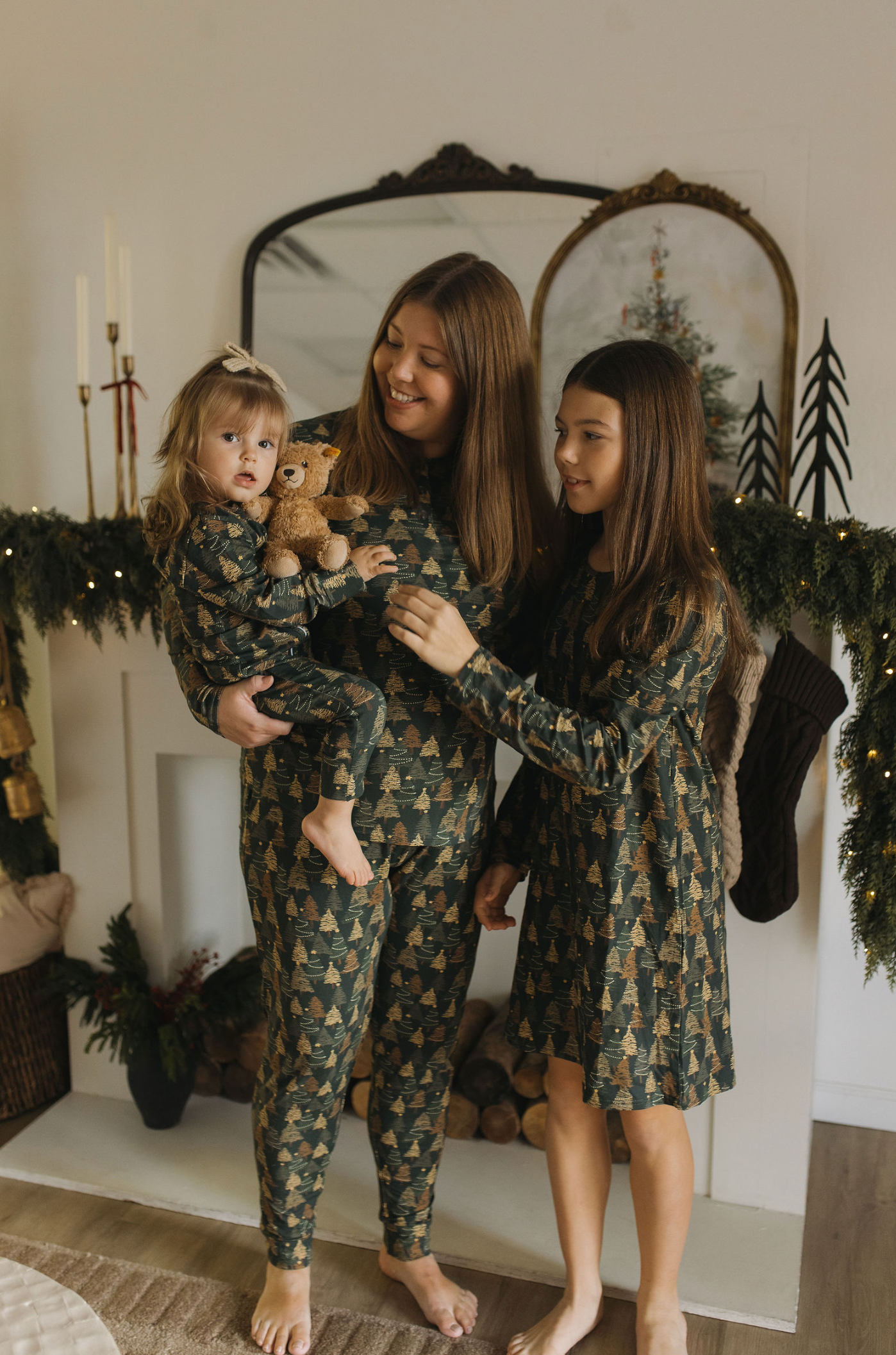 Wrap yourself in cozy holiday comfort with our Evergreen Glow print — a deep forest-green base accented with shimmering golden Christmas trees. This timeless design captures the magic of twinkling lights and quiet winter nights, perfect for matching family pajamas or lounging fireside all season long. Coordinates beautifully with our Gingerbread Lane collection for mix-and-match family photos.