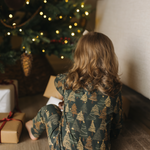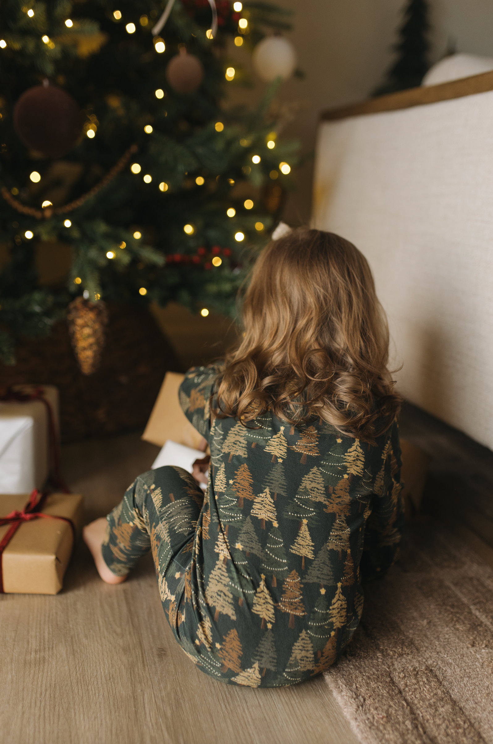 Wrap yourself in cozy holiday comfort with our Evergreen Glow print — a deep forest-green base accented with shimmering golden Christmas trees. This timeless design captures the magic of twinkling lights and quiet winter nights, perfect for matching family pajamas or lounging fireside all season long. Coordinates beautifully with our Gingerbread Lane collection for mix-and-match family photos.