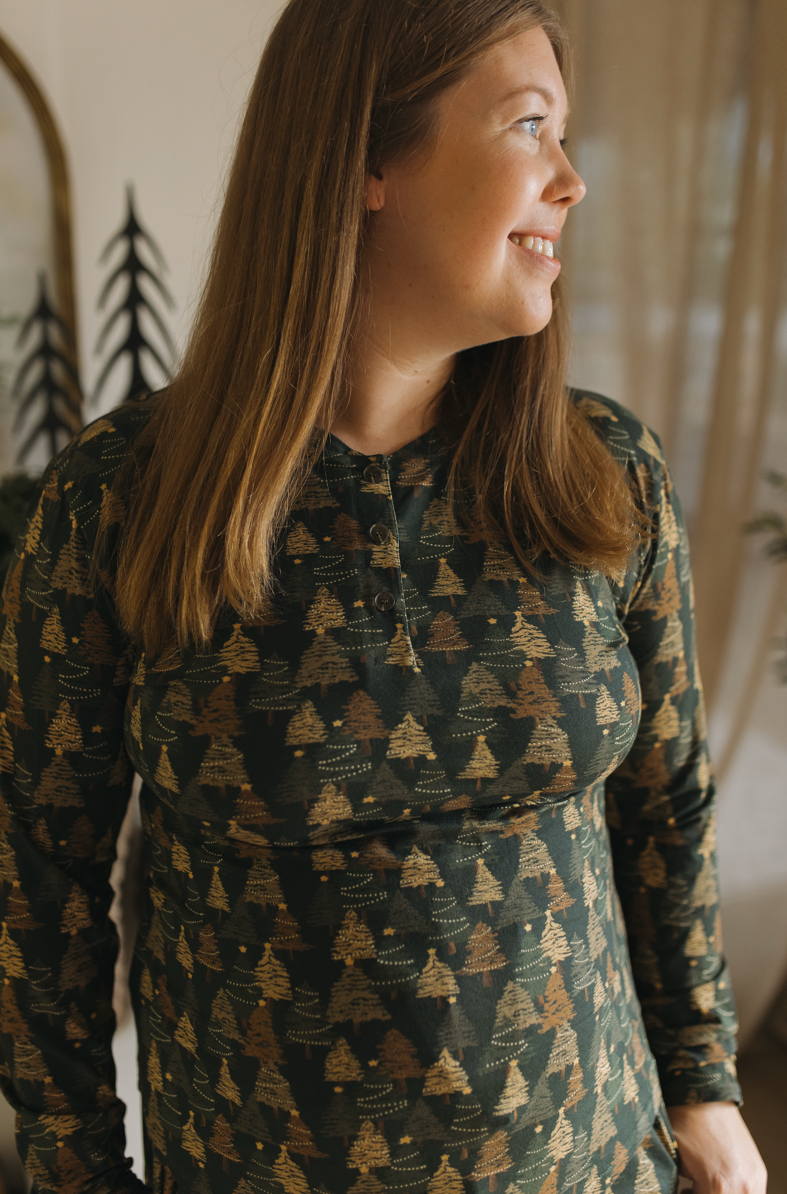 Wrap yourself in cozy holiday comfort with our Evergreen Glow print — a deep forest-green base accented with shimmering golden Christmas trees. This timeless design captures the magic of twinkling lights and quiet winter nights, perfect for matching family pajamas or lounging fireside all season long. Coordinates beautifully with our Gingerbread Lane collection for mix-and-match family photos.