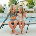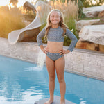 Our brand new Youth Cropped Rashguard Set combines the shoulder protection you want with the bikini style she wants. Featuring a long sleeve cropped top with a mid rise full coverage bottom. Featuring a stay put band on both top and bottom to ensure she is comfortable and covered all day long.