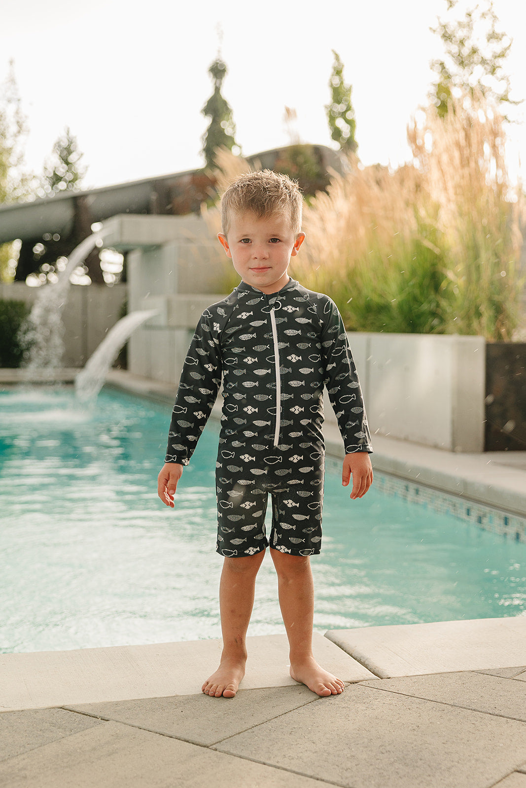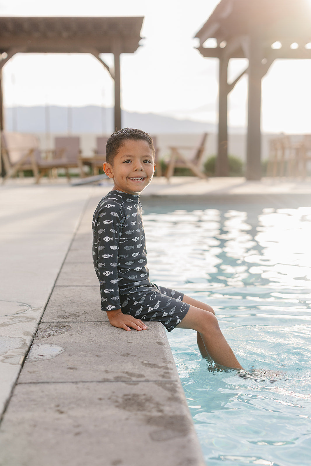 Keep your child safe from the sun without sacrificing style with our popular sunsuits! These one-piece swimsuits combine UPF 50+ protection of a rashguard with play-friendly shorts, making them perfect for all-day wear in and out of the water. Our ykk Zippers are designed for little fingers, ensuring easy potty breaks and wardrobe changes. Fully reversible, they can be worn with the zipper at the front or back for added versatility.