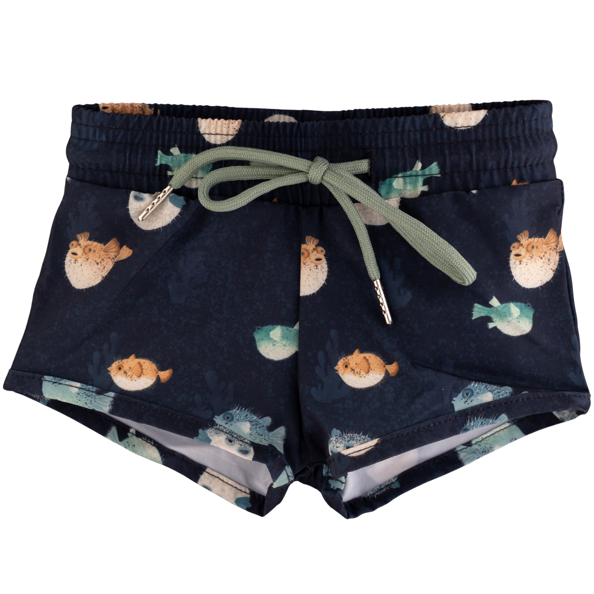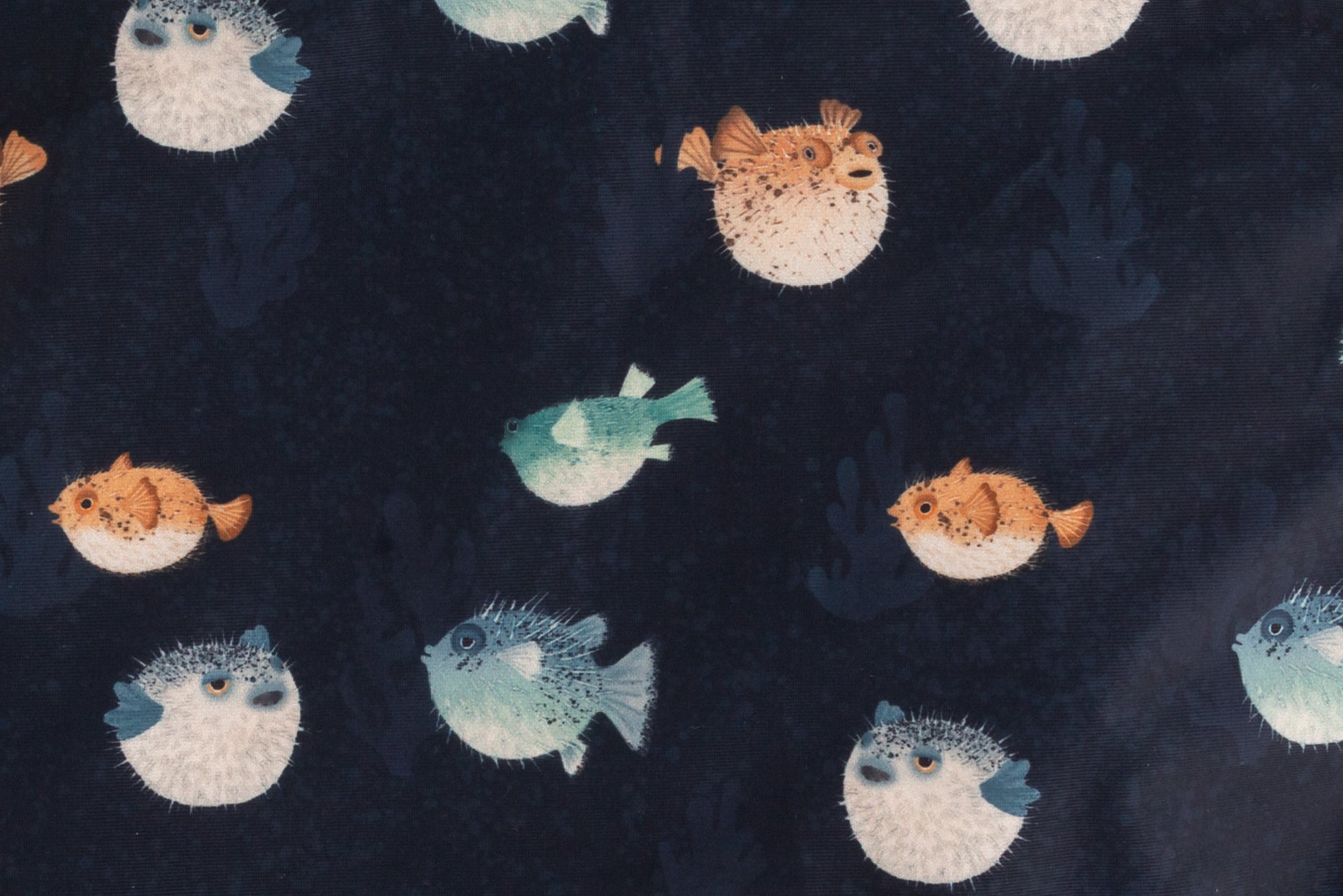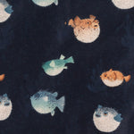 The "Brooks" is our print of the year, featuring the cutest hand drawn pufferfish around on a bubble blue navy base. Blues, Greens, Browns + a touch a Mint - this may just be the easiest print to accessorize we have ever done.