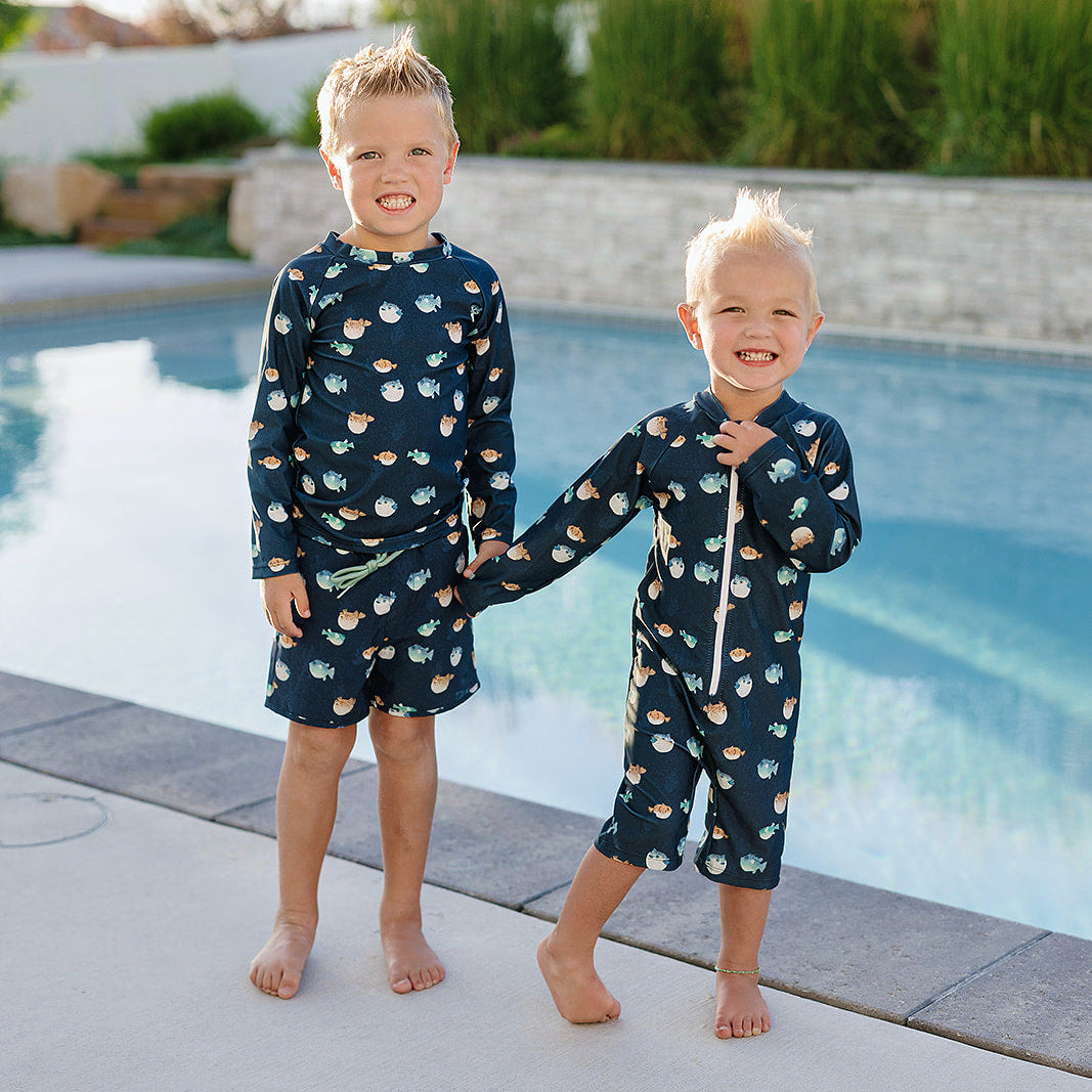 The "Brooks" is our print of the year, featuring the cutest hand drawn pufferfish around on a bubble blue navy base. Blues, Greens, Browns + a touch a Mint - this may just be the easiest print to accessorize we have ever done.