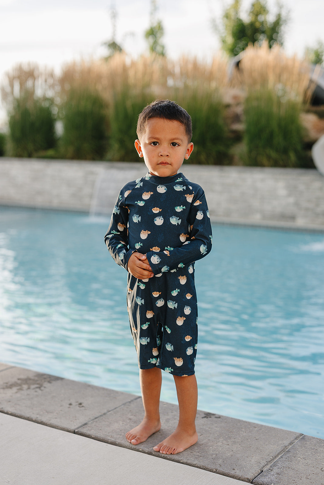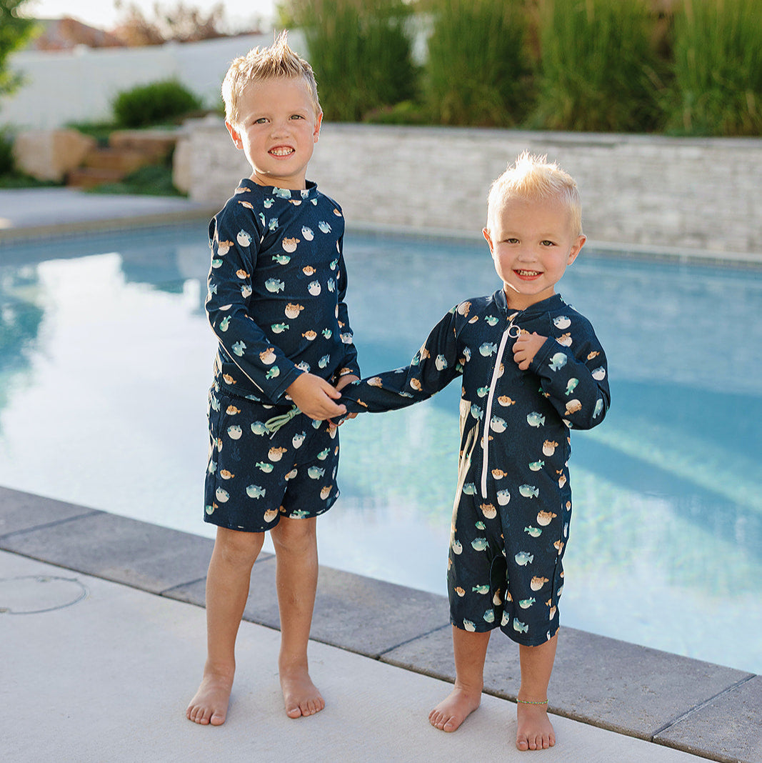 Keep your child safe from the sun without sacrificing style with our popular sunsuits! These one-piece swimsuits combine UPF 50+ protection of a rashguard with play-friendly shorts, making them perfect for all-day wear in and out of the water. Our ykk Zippers are designed for little fingers, ensuring easy potty breaks and wardrobe changes. Fully reversible, they can be worn with the zipper at the front or back for added versatility.