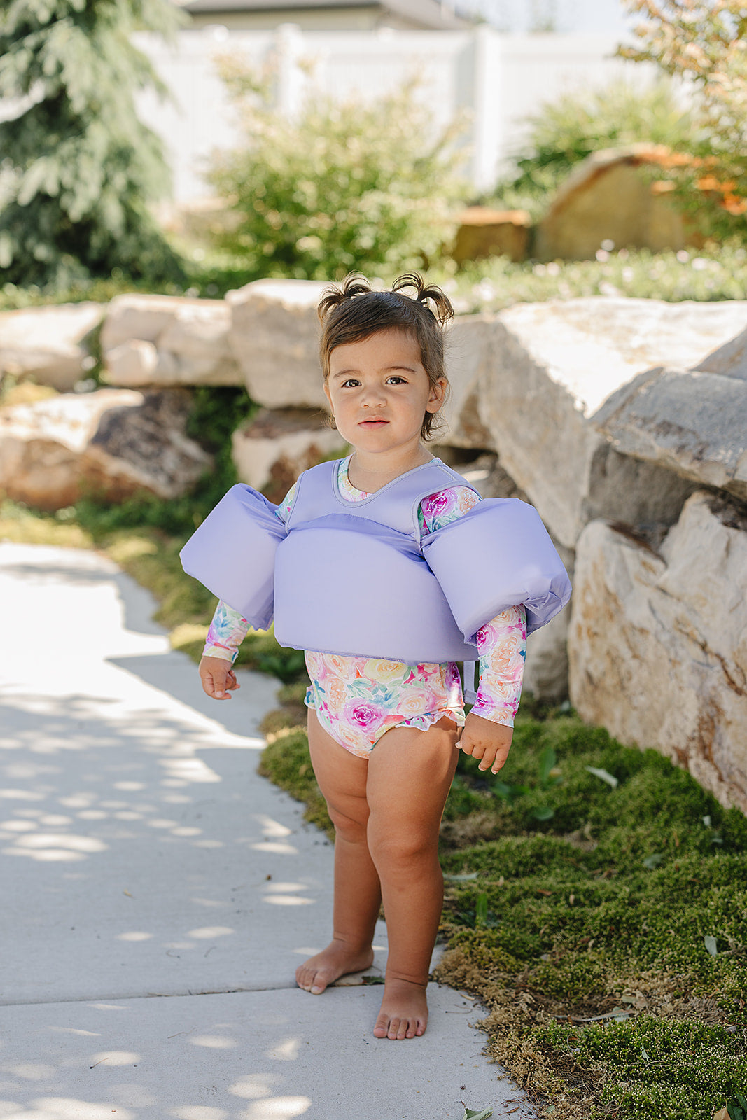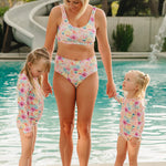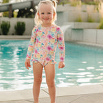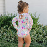 Ruffle Rashguard Suits offer Chemical Free, UPF 50+ Protection, in the sweetest designs around. The body of our swimsuits are fully lined for modesty, whereas the arms are left unlined to ensure full mobility. The shell of the swimsuit is made from our ultra soft + breathable Lycra fabric, providing 4-way stretch for all day comfort and play. These swimsuits conveniently come with crotch snaps in sizes up to 24M for easy diaper changes.