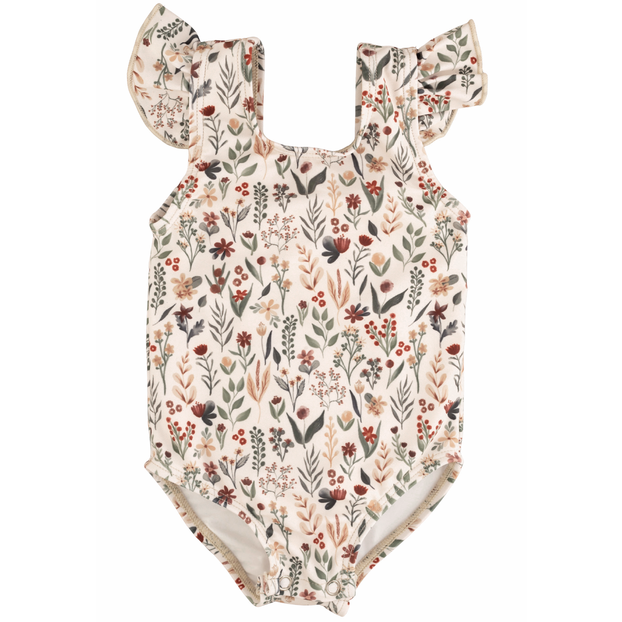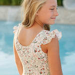 This swimsuit has an easy on and off design with the ruffle cap sleeve shoulder adding a feminine touch and extra sun protection to the shoulder area. The perfect swimsuit for everyday wear, or for little ones who prefer their suit without arms.