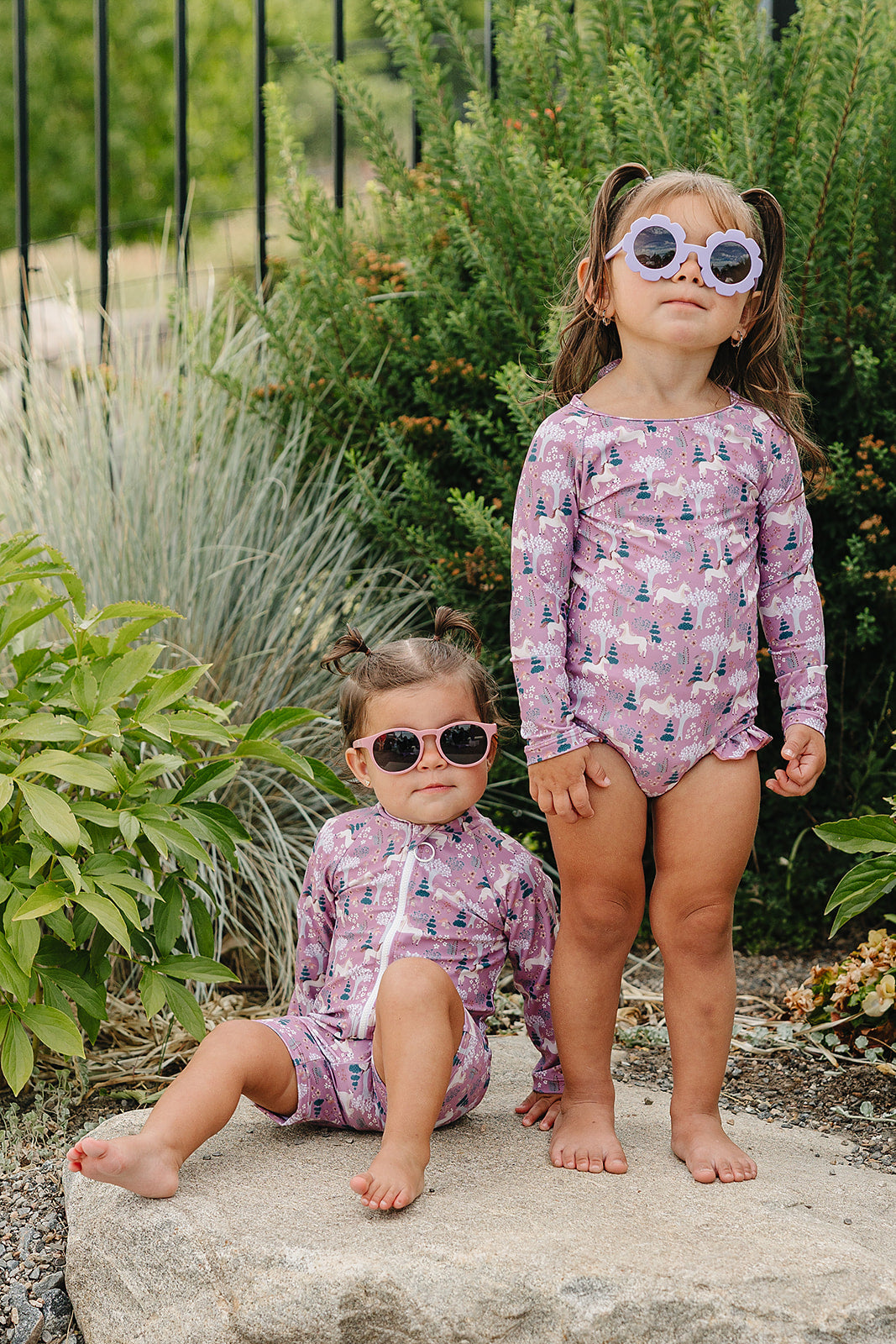 Ruffle Rashguard Suits offer Chemical Free, UPF 50+ Protection, in the sweetest designs around. The body of our swimsuits are fully lined for modesty, whereas the arms are left unlined to ensure full mobility. The shell of the swimsuit is made from our ultra soft + breathable Lycra fabric, providing 4-way stretch for all day comfort and play. These swimsuits conveniently come with crotch snaps in sizes up to 24M for easy diaper changes.