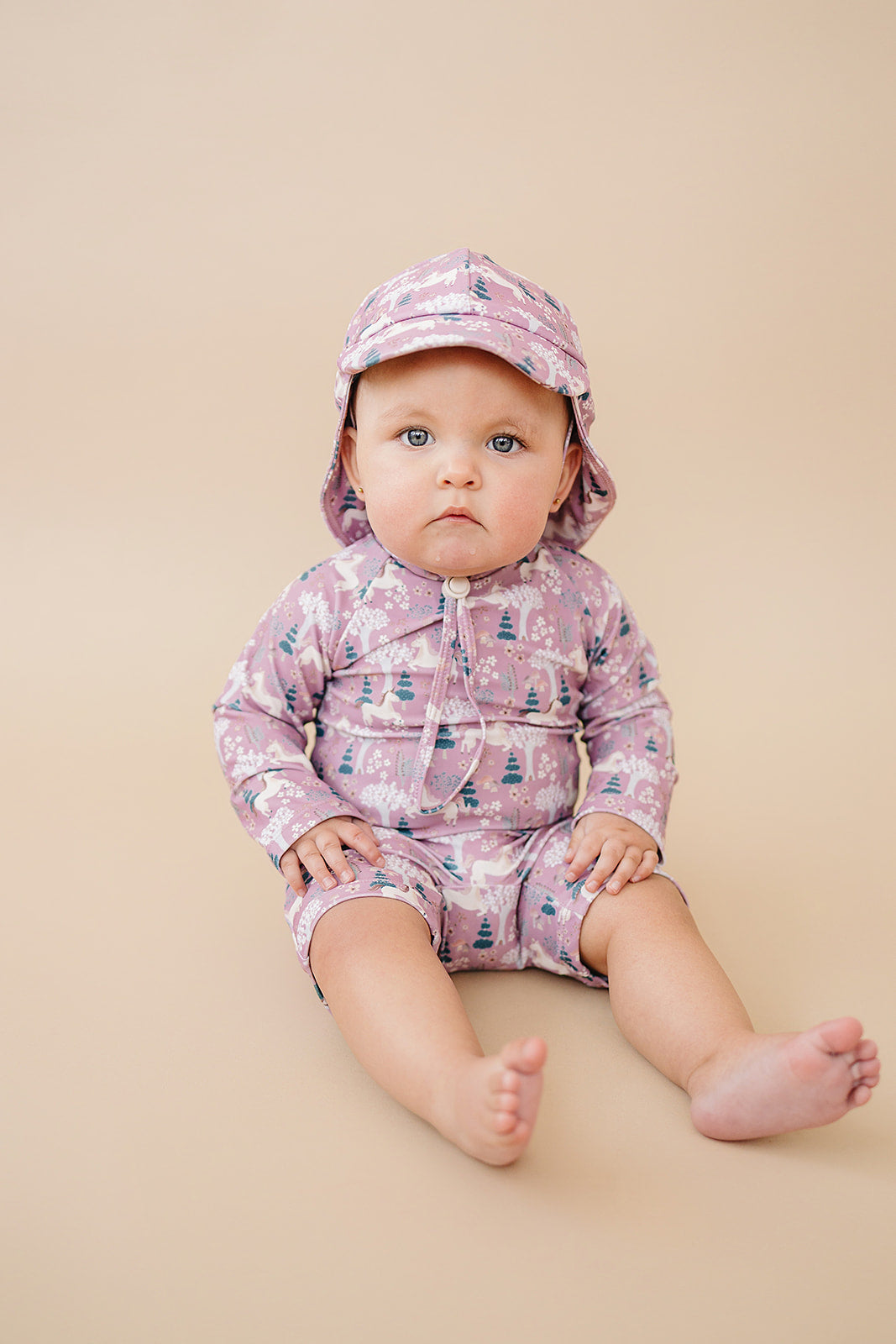 Whimsical and dreamy, The "Kinsley" features hand-drawn unicorns prancing through a magical forest of blooming trees, mushrooms, and florals. Soft blush and earthy tones bring this enchanting scene to life — perfect for little ones and full family matching moments. This base is an exact tonal match for our Berry hat, and pairs beautifully with all of our Pinks + Purples.
