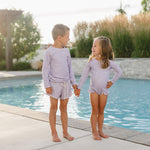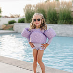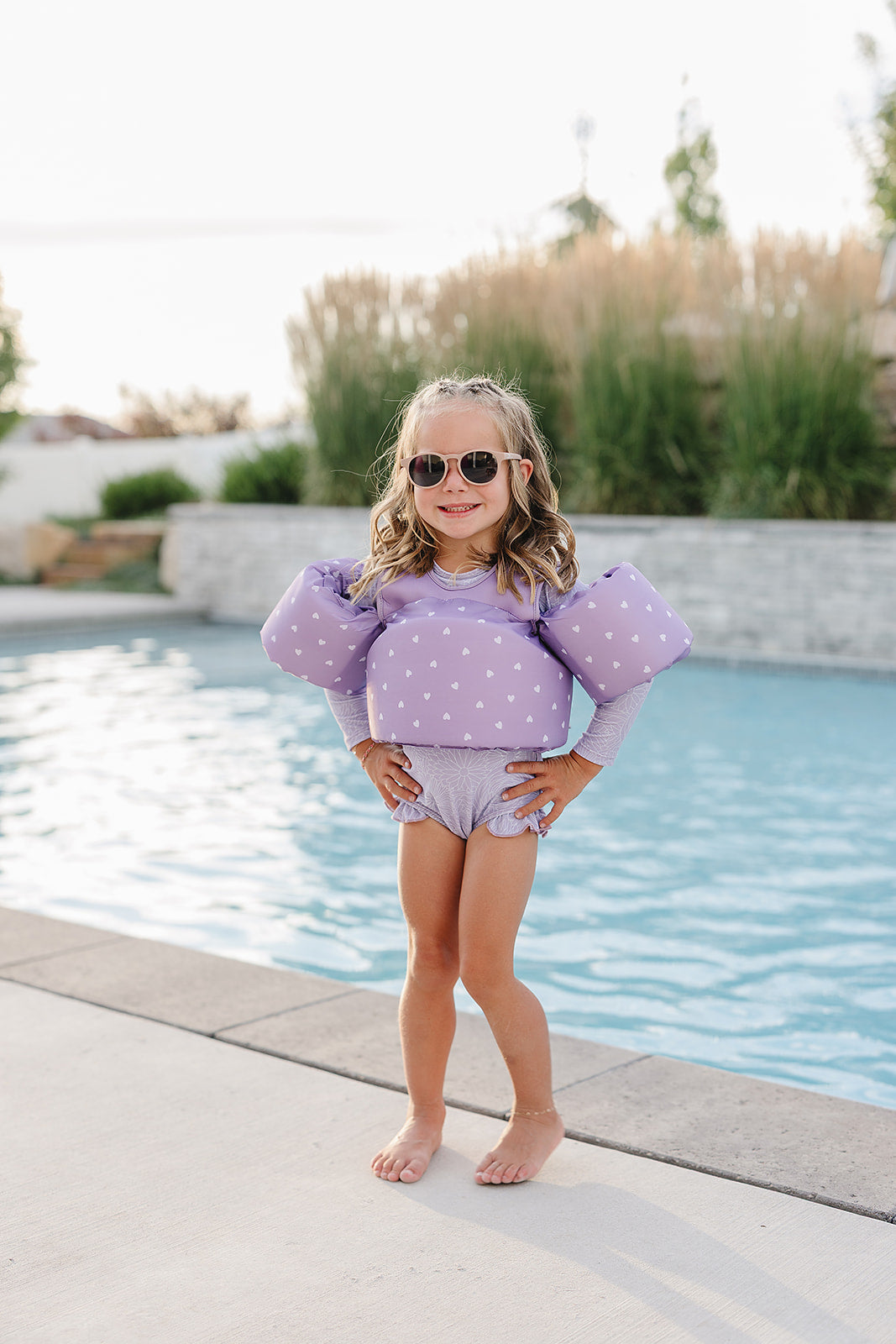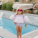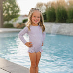 Ruffle Rashguard Suits offer Chemical Free, UPF 50+ Protection, in the sweetest designs around. The body of our swimsuits are fully lined for modesty, whereas the arms are left unlined to ensure full mobility. The shell of the swimsuit is made from our ultra soft + breathable Lycra fabric, providing 4-way stretch for all day comfort and play. These swimsuits conveniently come with crotch snaps in sizes up to 24M for easy diaper changes.