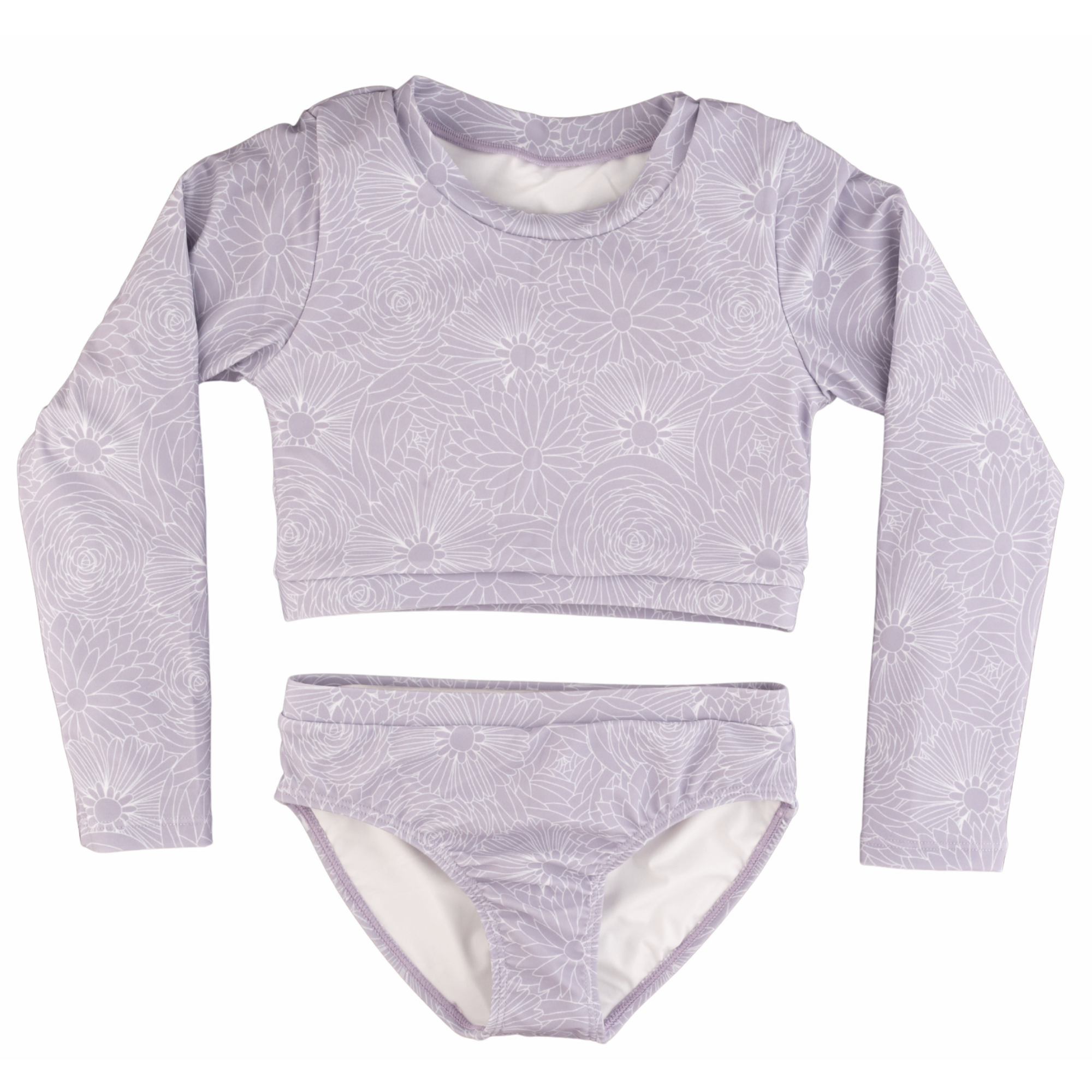 Our brand new Youth Cropped Rashguard Set combines the shoulder protection you want with the bikini style she wants. Featuring a long sleeve cropped top with a mid rise full coverage bottom. Featuring a stay put band on both top and bottom to ensure she is comfortable and covered all day long.